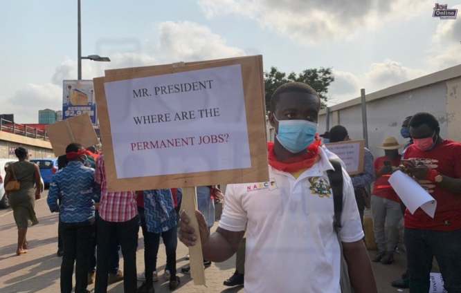The NABCO Trainees demonstrated against the government’s refusal to give them permanent jobs after their 3-year contract expired in October last year.