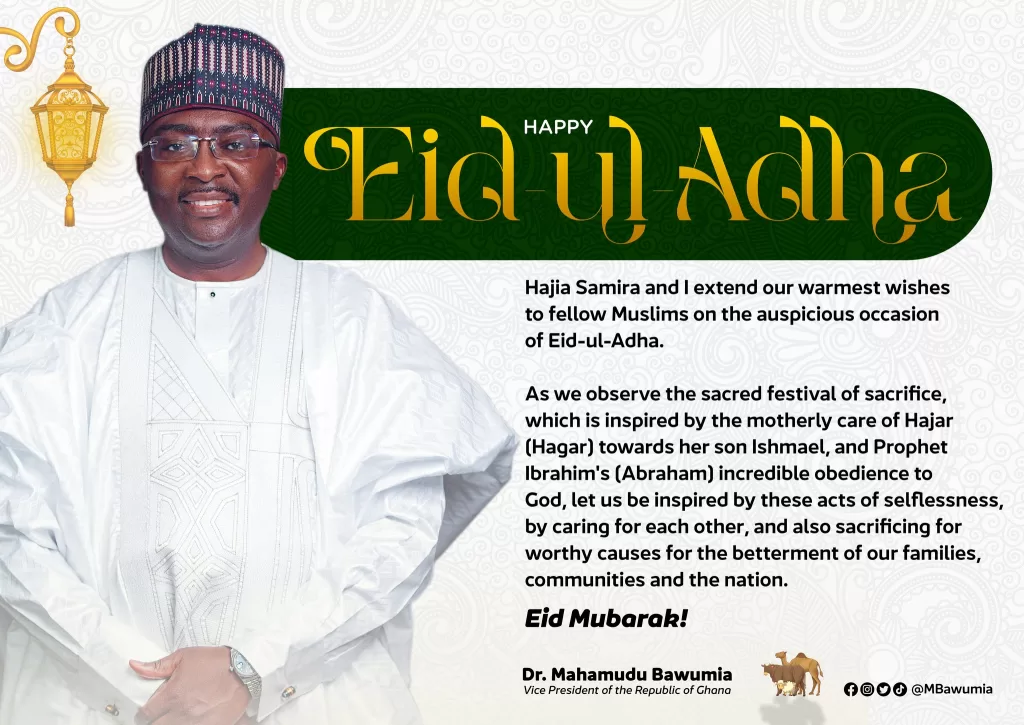 “Hajia Samira Bawumia and I extend our warmest wishes to fellow Muslims on the auspicious occasion of Eid-ul Adha.
