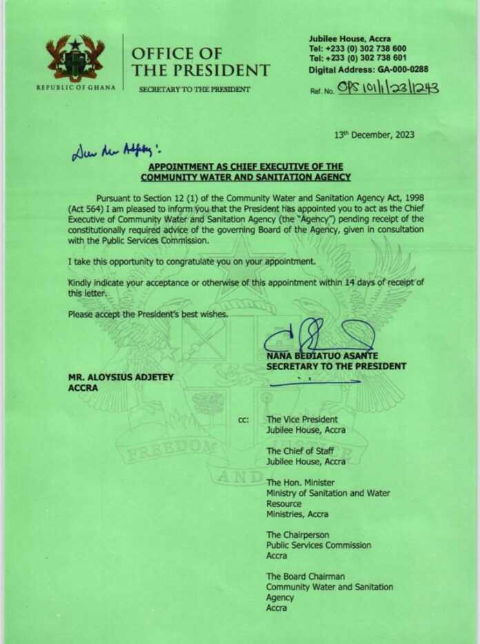 This appointment according to a letter dated 13th December 2023 by the Secretary to the President, Nana Bediatuo Asante is in line with Section 12(1) of the Community Water and Sanitation Agency Act, 1998 (Act 564).