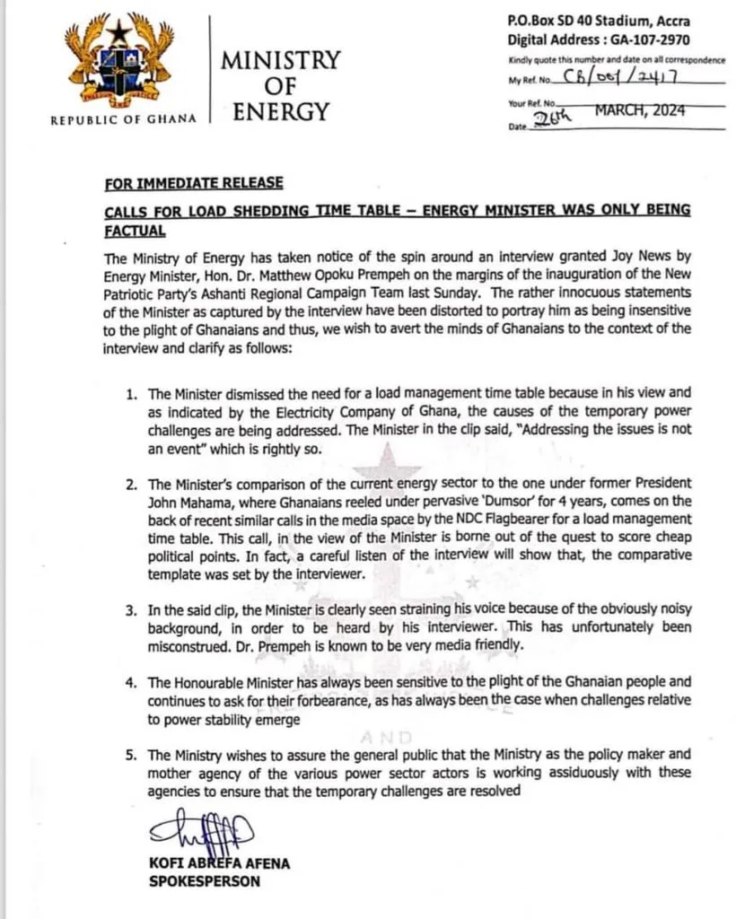 The Ministry of Energy has denounced recent reports suggesting that Energy Minister Dr. Matthew Opoku Prempeh’s remarks on the issuance of a load-shedding timetable were intentionally misrepresented by the media to depict him as insensitive.