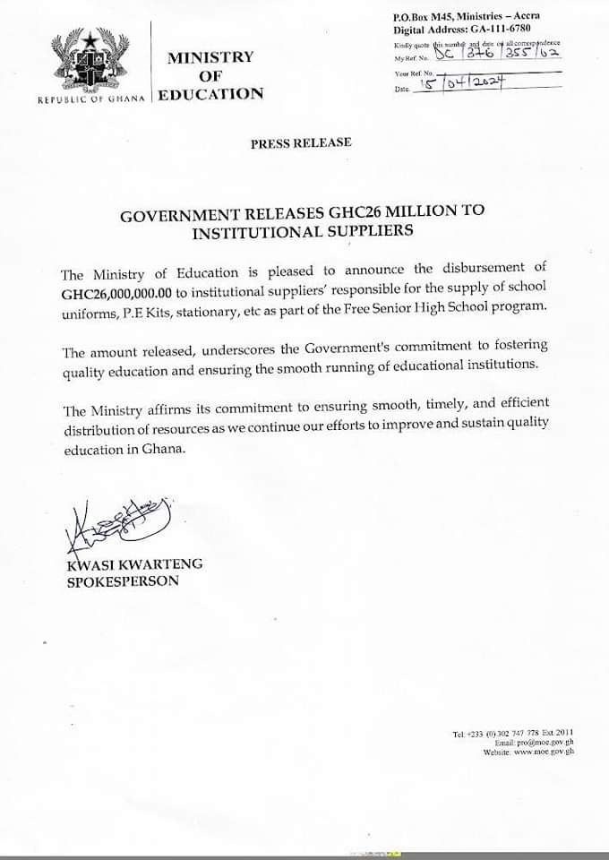 “The Ministry of Education is pleased to announce the disbursement of GHC26,000,000.00 to institutional suppliers’ responsible for the supply of school uniforms, P.E Kits, Stationary,etc as part of the Free Senior High School programs”, the Statement read.