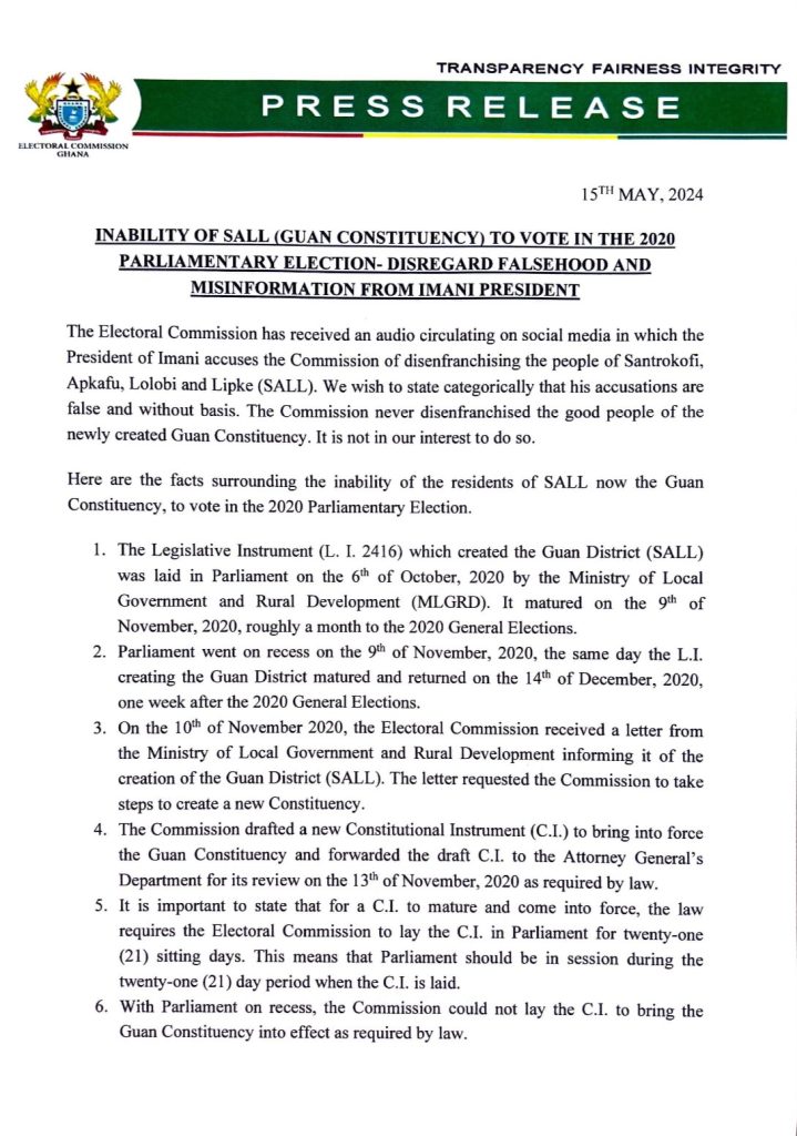 The Guan (SALL) Constituency according to the Statement by the E.C could not be created due to a recess Parliament went on ahead of the 2020 general election. The Statement clarified that, processes and procedures needed create the constituency were followed only for Parliament to go on recess.
