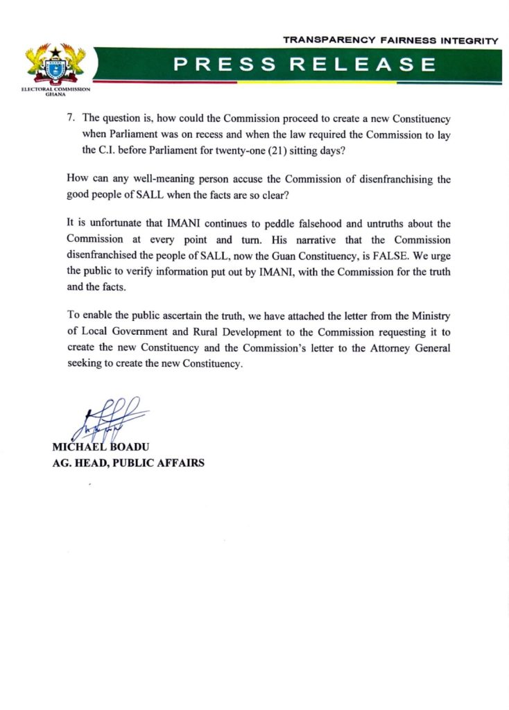 According to a statement signed by the Acting Head of Public Affairs at the Electoral Commission, Michael Boadu, the Electoral Commission finds the audio circulating on social media in which the President of IMANI Ghana accuses the commission of disenfranchising the people of SALL as false and without basis.
