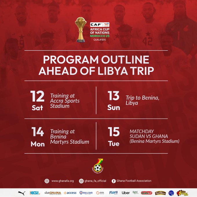 The Black Stars are set to depart Ghana today, October 13, 2024, for Libya as they gear up for a crucial second-leg match against Sudan in the 2025 Africa Cup of Nations (AFCON) qualifiers.