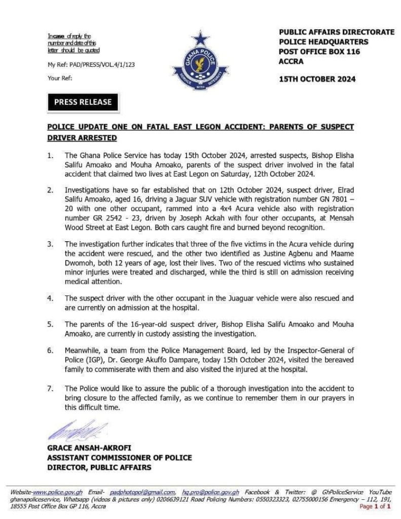 Meanwhile, Bishop Elisha Salifu Amoako of Alive Chapel International and the mother of his son, Mouha Amoako, have been arrested and detained by the police following their son’s involvement in the East Legon accident last Saturday, which resulted in the tragic deaths of the two 12-year-old girls.
