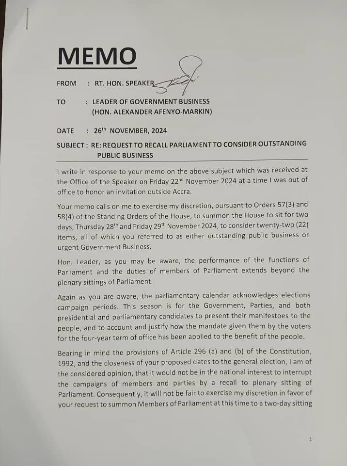 The memo dated 26th November 2024, SUBJECT : RE: REQUEST TO RECALL PARLIAMENT TO CONSIDER OUTSTANDING PUBLIC BUSINESS noted that this season is for the Government, Parties, and both presidential and parliamentary candidates to present their manifestoes to the people, and to account and justify how the mandate given them by the voters for the four-year term of office has been applied to the benefit of the people.