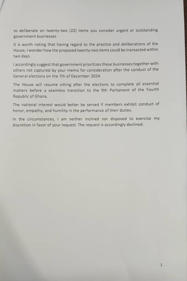 Mr. Speaker in the memo noted that, the House will resume sitting after the elections to complete all essential matters before a seamless transition to the 9th Parliament of the Fourth Republic of Ghana and that, “I accordingly suggest that government prioritizes these businesses together with others not captured by your memo for consideration after the conduct of the General elections on the 7th of December 2024”.