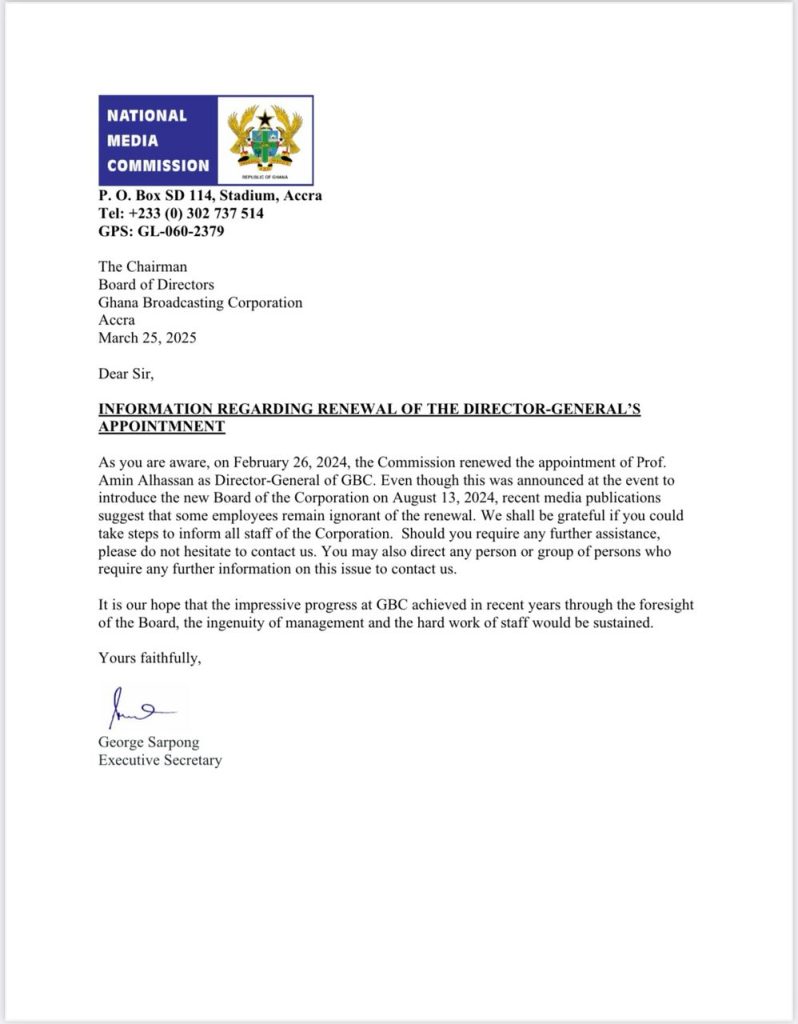 In a letter dated March 25, 2025, and signed by its Executive Secretary, George Sarpong to the Board Chairman of GBC, the NMC stated that the decision to renew Prof. Amin Alhassan’s tenure was made earlier, declared on February 26, 2024 and publicly announced during the introduction of GBC’s new Board on August 13, 2024.