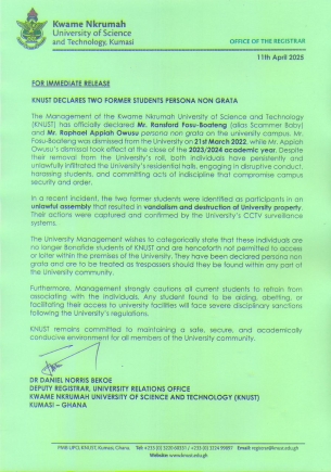 The management of the Kwame Nkrumah University of Science and Technology (KNUST) has declared two dismissed students—Ransford Fosu-Boateng, popularly known as “Scammer Baby,” and Raphael Appiah Owusu—persona non grata following repeated instances of unauthorised entry onto campus premises.