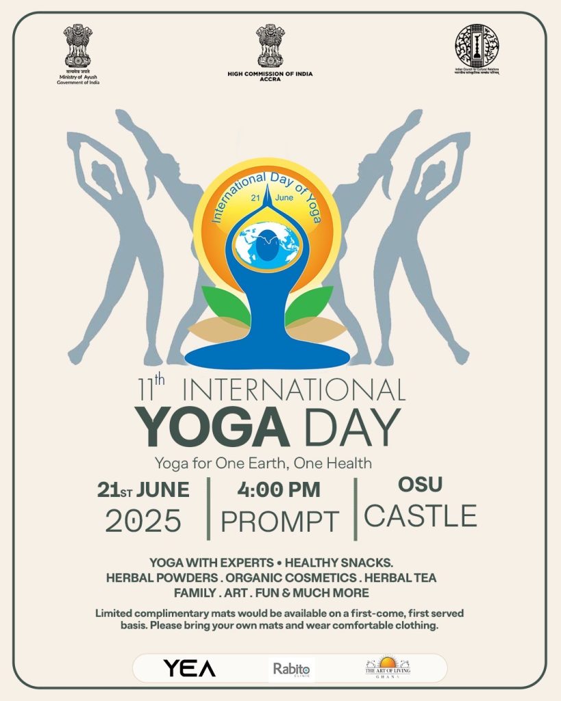 The India High Commission in Ghana will host the 11th edition of the International Day of Yoga on Saturday, June 21, 2025, at Osu Castle in Accra. The event is scheduled to begin promptly at 4:00 p.m.