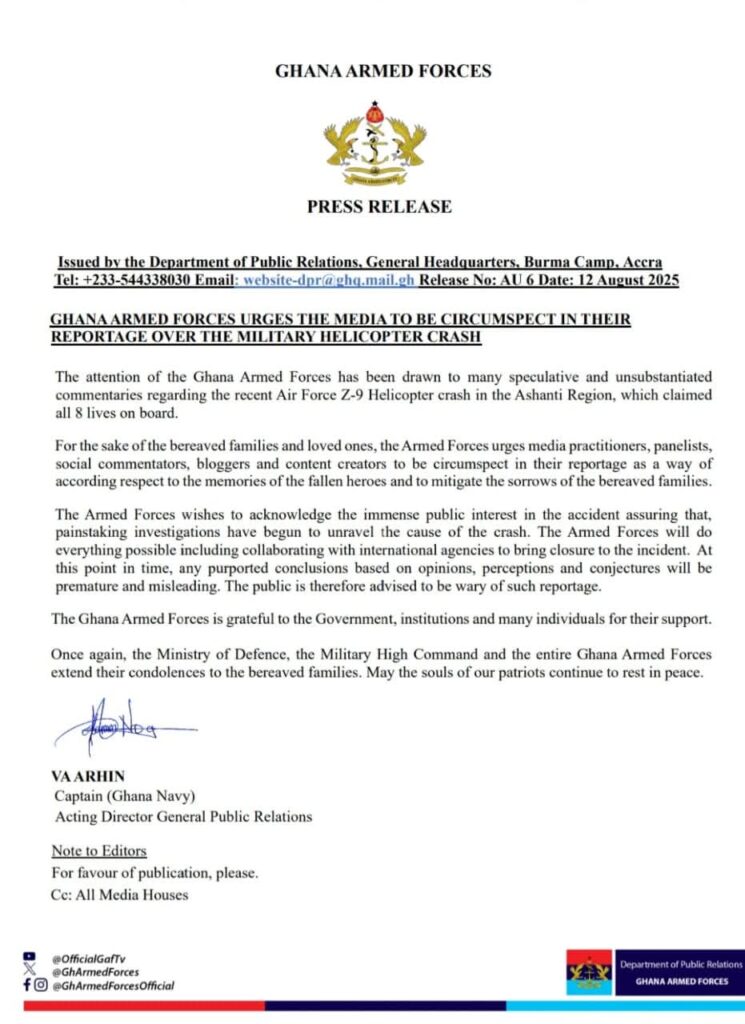The Ghana Armed Forces (GAF) has appealed to the media to exercise caution and responsibility in their coverage of the recent Air Force Z-9 helicopter crash in the Ashanti Region, which killed all eight people on board.