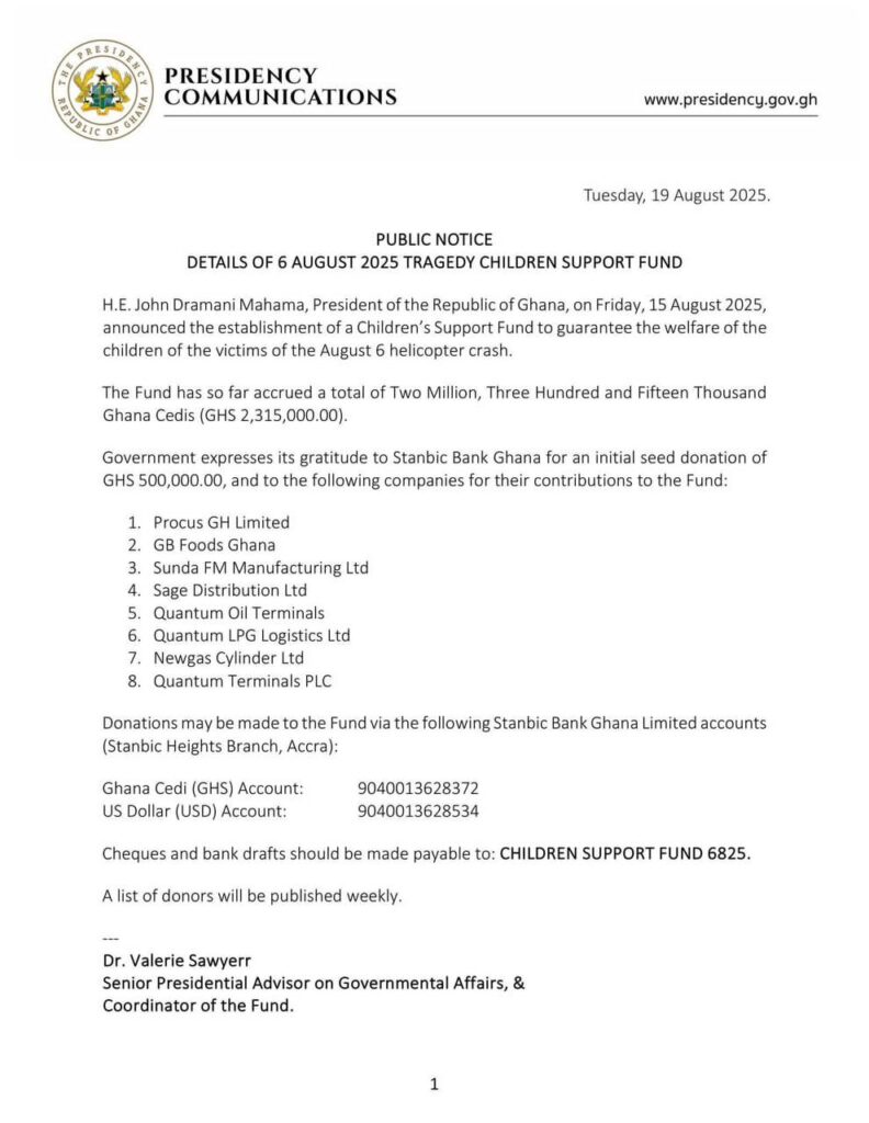 The Children’s Support Fund, set up by President John Dramani Mahama to care for the children of victims of the August 6 military helicopter crash, has so far raised GH¢2.315 million.
