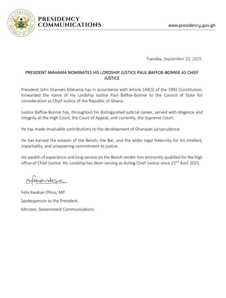 Acting Chief Justice (CJ), His Lordship Justice Paul Baffoe-Bonnie, has been nominated by President John Dramani Mahama as the next Chief Justice of Ghana following the removal of Gertrude Torkornoo. The Minister of Government Communications, Mr. Felix Kwakye Ofosu, who announced this through a press statement issued on Tuesday, September 23, 2025, said the nomination was in line with Article 144(1) of the 1992 Constitution.
