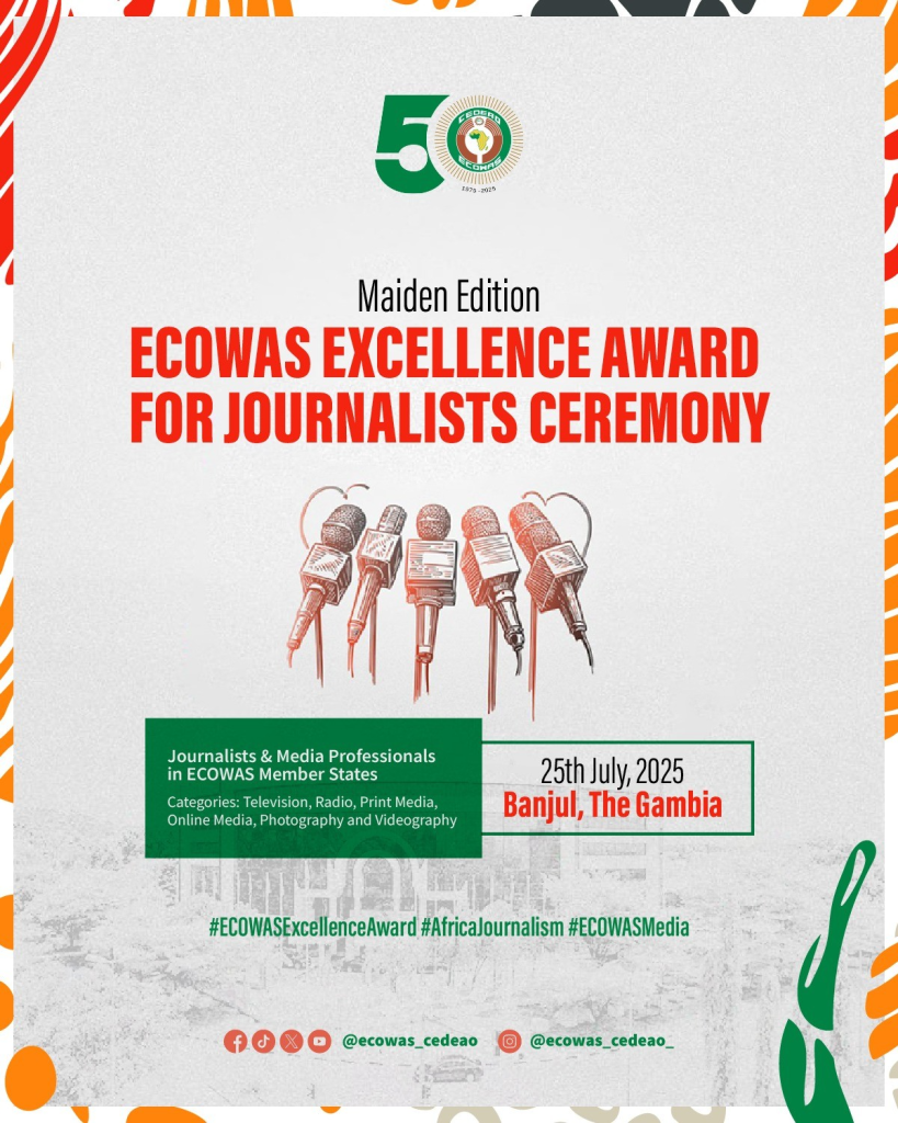 The official award ceremony for the inaugural ECOWAS Excellence Award for Journalists will take place on July 25, 2025, in Banjul, The Gambia.