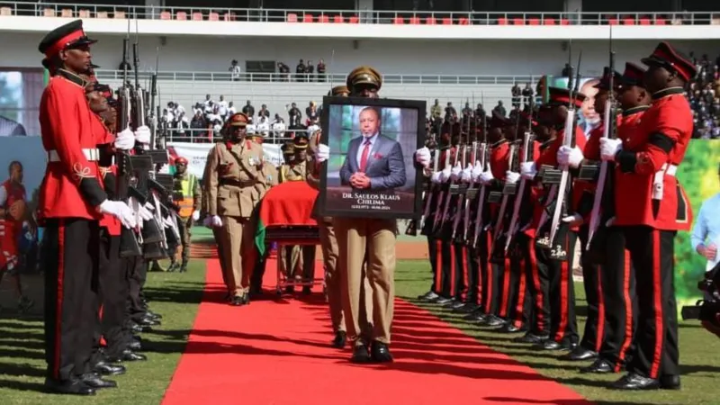 His coffin, draped in Malawi’s red, green and black flag, was brought into the stadium by a guard of honour.