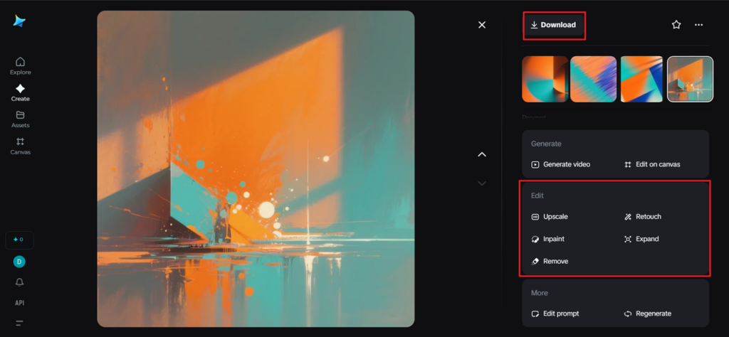 You can use Dreamina’s AI customization tools to fine-tune your design (Inpaint to continue your color transitions; Expand to continue your gradient across the canvas; Remove to clear up areas that feel overwhelmed; and Retouch to intensify the vibrancy and afterimage effect). Once you are satisfied, click Download to then store your memory-evoking creation.