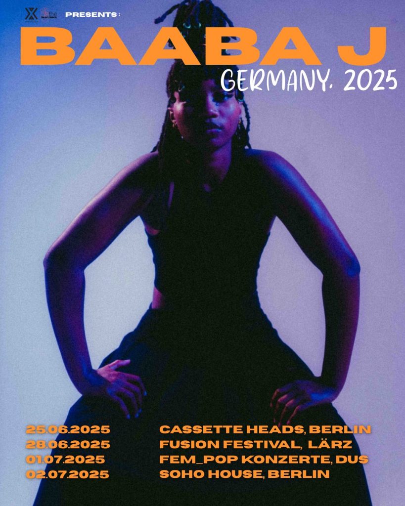 Baaba J will perform in three German cities this summer, with the following dates and venues confirmed: 25 June 2025 at Cassette Heads in Berlin, 28 June at Fusion Festival in Lärz, 1 July at Fem_Pop Konzerte in Düsseldorf, and 2 July at Soho House, also in Berlin.