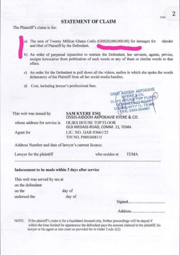 As a result of this, Empress Gifty is claiming against the defendant the sum of Twenty Million Ghana Cedis (GHS20,000,000.00) for damages for slander and libel of Plaintiff by the Defendant.