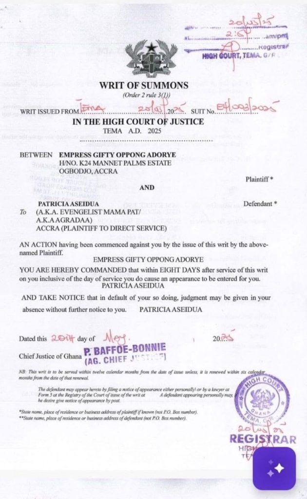 Ghanaian gospel musician Gifty Oppong Adorye, known in showbiz as Empress Gifty, has sued Evangelist Patricia Asiedu (Nana Agradaa) of Heavens Way Church for making defamatory statements about her.