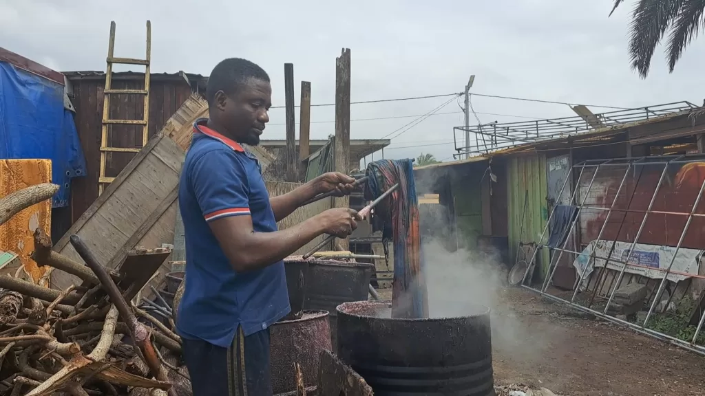 Mr. Emmanuel Mensah and his assistant busily and skillfully remove yards of dyed cloth with the aid of sticks from metal barrels placed over burning firewood while they work assiduously towards the end of another resist-dyeing process.