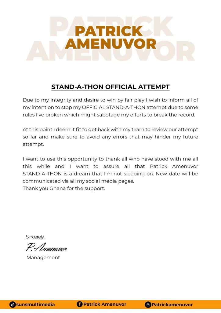 “I want to use this opportunity to thank all who have stood with me all this while, and I want to assure all that Patrick Amenuvor STAND-A-THON is a dream that I’m not sleeping on. New date will be communicated via all my social media pages,” he stated in the press release.