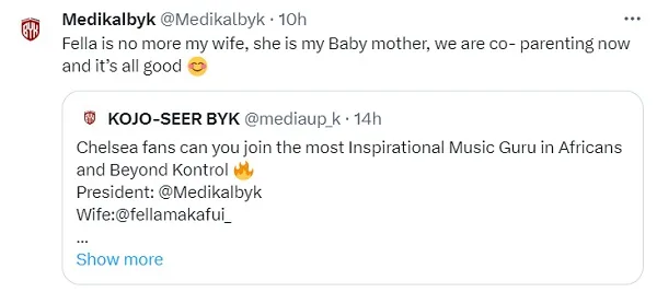 In his tweet, Medikal stated, “Fella is no longer my wife; she is the mother of my child. We are now co-parenting, and everything is going well.”