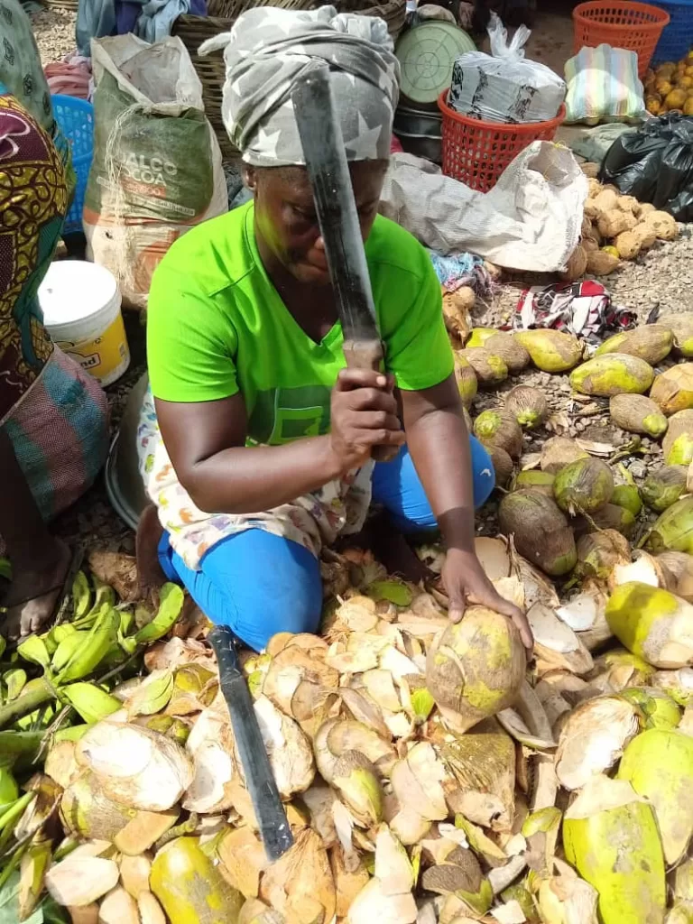 Aunty Addai decided to challenge the status quo. She recognised the demand for coconuts and the profit potential and shifted her focus to the coconut trade, overcoming her initial fears, she mastered the art of dehusking and found the business more lucrative than selling food crops. On average, Ghanaians consume about 30,000 tonnes of coconut a day.