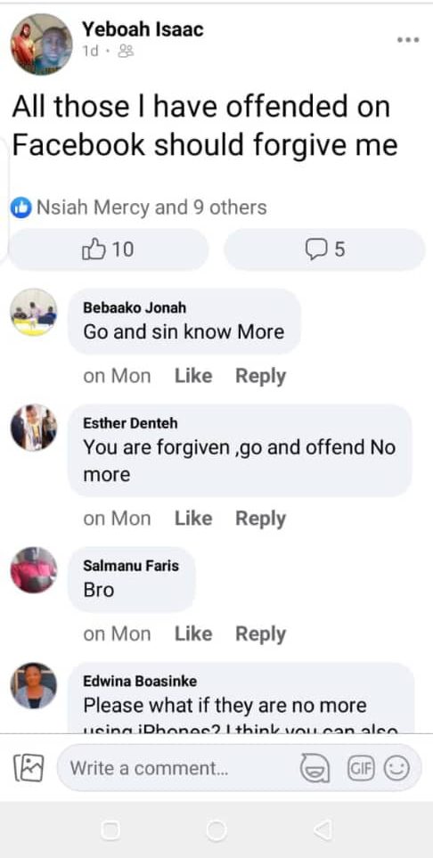 ”All those I have offended on Facebook should forgive me”, according to the purported scribbling by Yeboah.