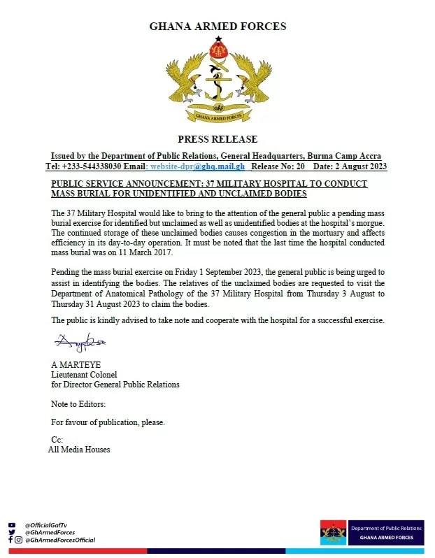The 37 Military Hospital has issued a public service announcement regarding a forthcoming mass burial exercise for unidentified and unclaimed bodies in its morgue.