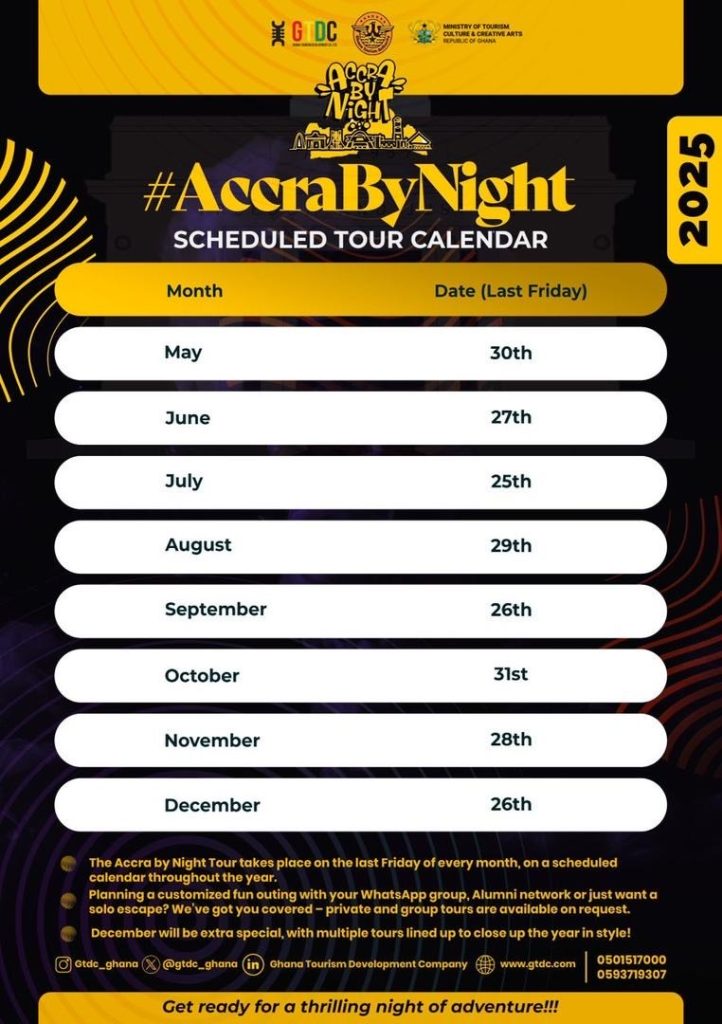 Currently, the initiative operates with one double-decker bus with tours, scheduled for the last Friday of each month, offering visitors comprehensive night time experiences of Accra’s landmarks and entertainment districts.