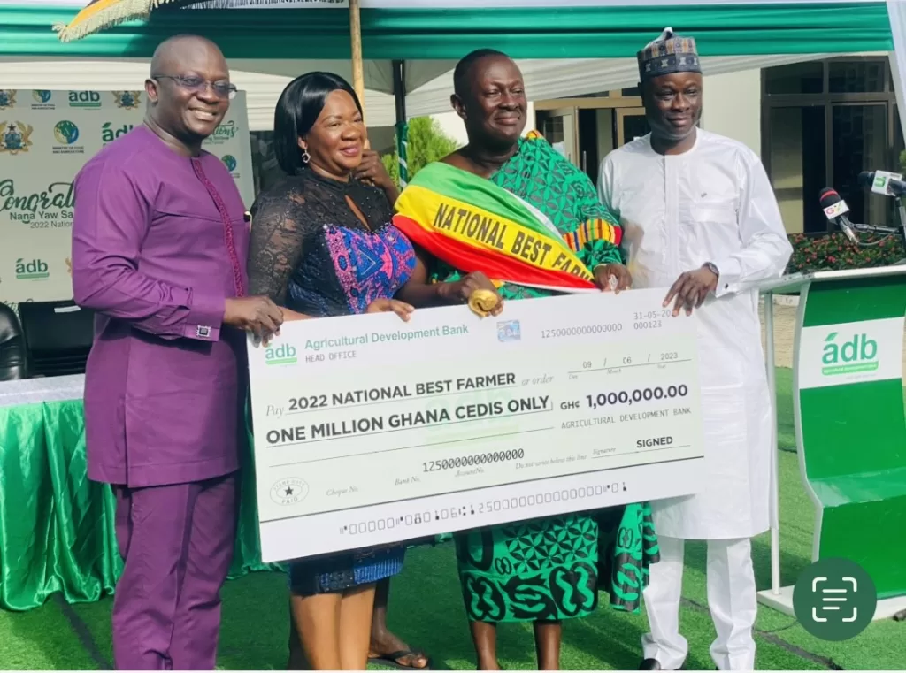 The Agricultural Development Bank (ADB) has presented a cheque of one million Ghana cedis (GHC 1m) to the 2022 National Best Farmer, the Akyɛmpimhene of the Juaben Traditional Area in the Ashanti Region, Nana Yaw Sarpong Siriboe.
