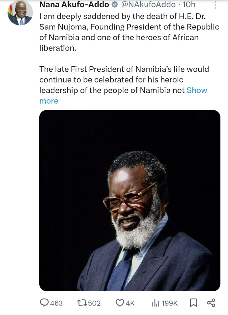 Akufo-Addo, in a tribute shared on “X” (formerly Twitter), described Nujoma as a hero of African liberation, whose legacy would continue to inspire generations.