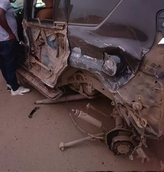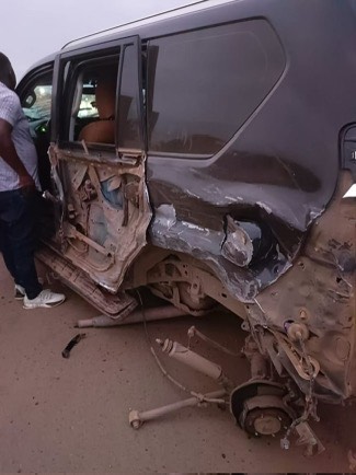 The vehicle, a Land Cruiser with registration number GR 6521-21, managed to avoid a head-on collision with a pickup truck that had veered into their lane, resulting in significant damage to their vehicle.