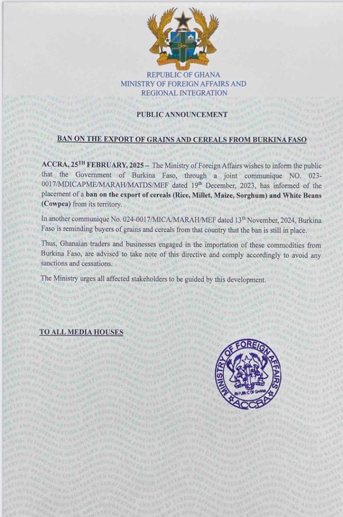 The Ministry of Foreign Affairs has issued a public announcement reminding traders that Burkina Faso’s ban on the export of key grains and cereals remains in place.