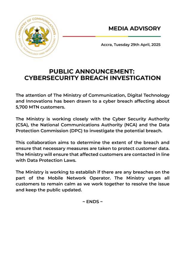 In an official statement released on April 29, 2025, the Ministry confirmed that it is working closely with the Cyber Security Authority (CSA), the National Communications Authority (NCA), and the Data Protection Commission (DPC) to probe the incident.