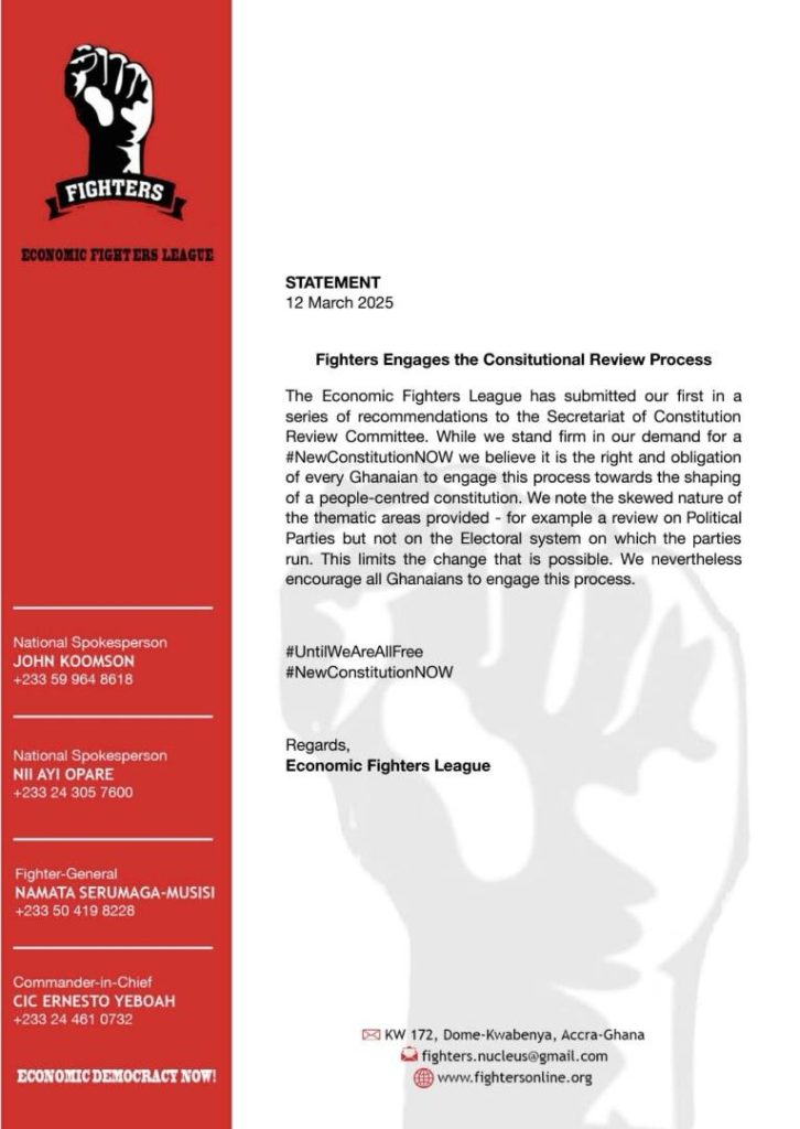 The Economic Fighters League has submitted a comprehensive proposal to the Constitutional Review Committee (CRC), outlining significant changes to how Ghana manages its land and natural resources. The submission, dated March 12, 2025, focuses on amending Article 257 of the Constitution to vest public lands directly in the people of Ghana, rather than the President.