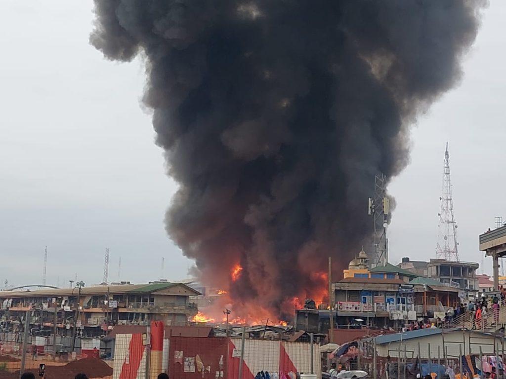 A devastating fire broke out early this morning at the Adum Railways trading hub, located at a popular spot known as “Blue Gate.” The blaze began around 5:30 a.m., and the cause is still unknown.