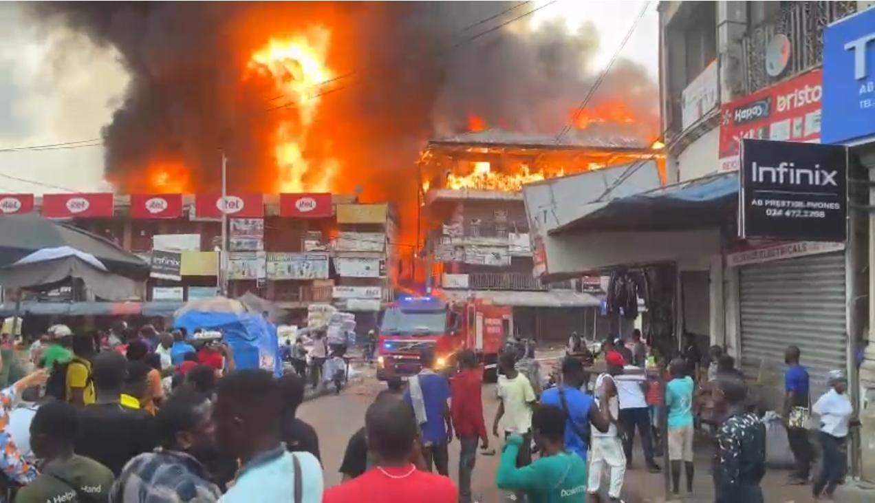 A devastating fire broke out early this morning at the Adum Railways trading hub, located at a popular spot known as “Blue Gate.” The blaze began around 5:30 a.m., and the cause is still unknown.