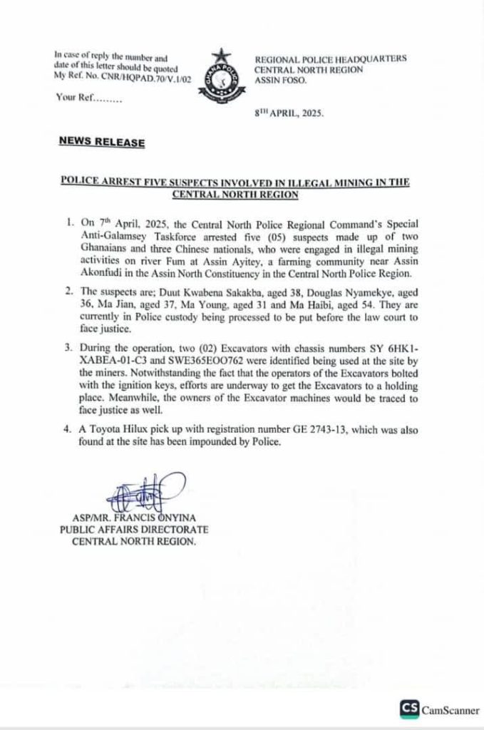 The Central North Police Regional Command’s Anti- Galamsey Taskforce has arrested five suspects involved in illegal mining activities on river Fum at Assin Ayitey, a farming community near Assin Akonfudi in the Assin North Constituency on April 7, 2025. The suspects include two Ghanaians and three Chinese nationals.