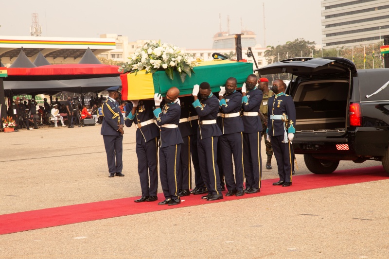Gun carriage bearing Jerry John Rawlings’ coffin passed through streets lined with well-wishers before he was conveyed to the Military Cemetery in Burma Camp where he was laid to rest.
