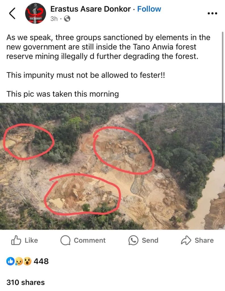 Award winning Journalist, Erastus Asare Donkor recently posted a photo on social media, with a caption stating that “as we speak, three groups sanctioned by elements in the new government are inside the Tano Anwia forest reserve mining illegally further degrading the forest. This impunity must not be allowed to fester!!!” This post has sparked outrage and fuelled calls for renewed action.