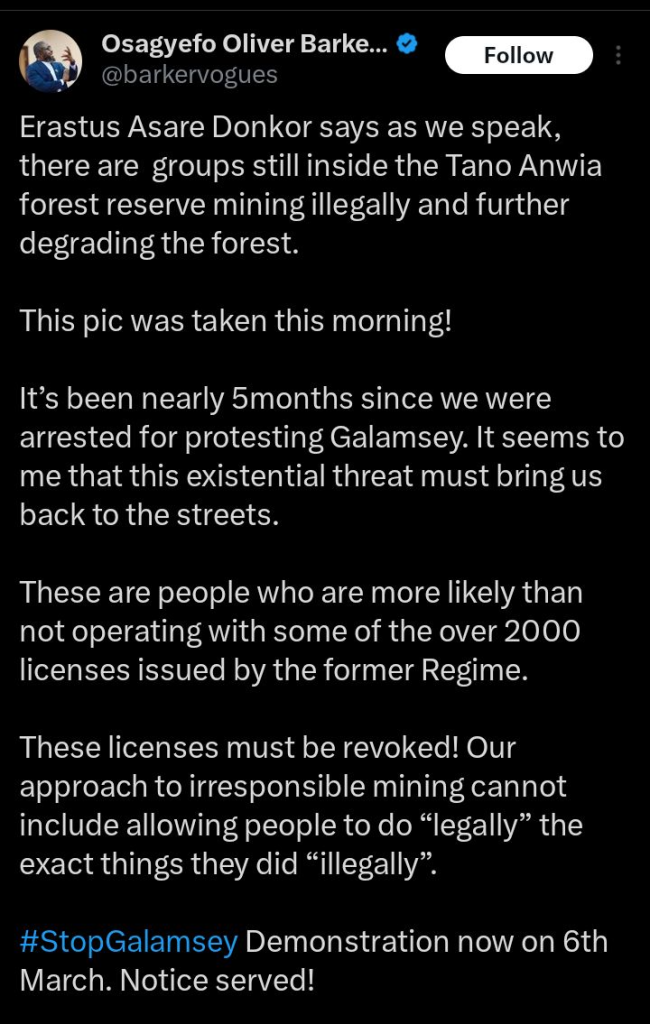 Erastus’ post, further amplified by activist Oliver Barker-Vormawo, on the X platform was used to announce that he is planning a “StopGalamsey” demonstration on March 6th. Barker-Vormawor’s post stated that despite his arrest nearly five months ago for protesting against galamsey, the problem is far from resolved. He contends that the continued destruction of the Tano Anwia forest demands a return to the streets.