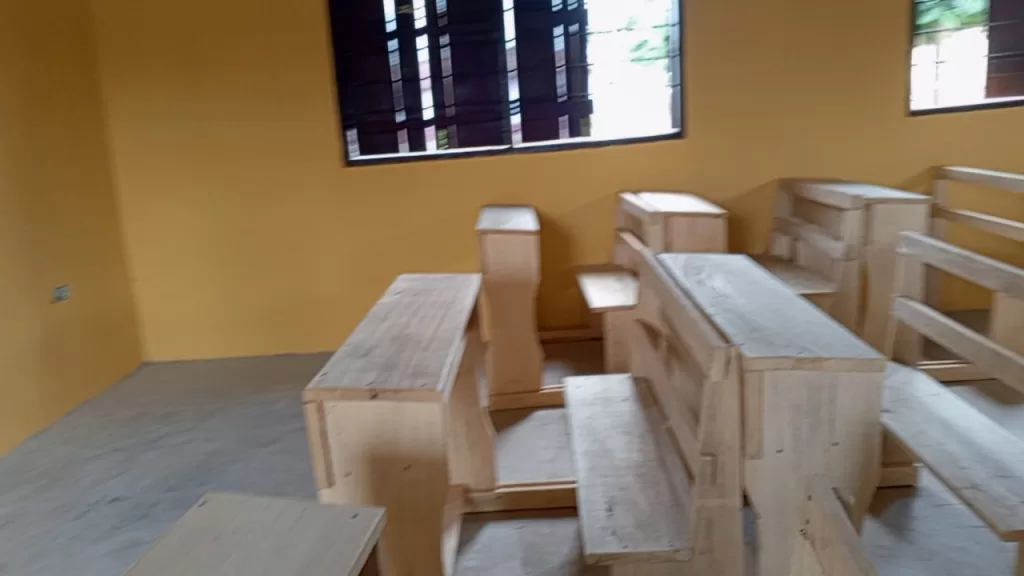 The newly constructed school building fully-funded by the Ayensuano District Assembly includes a three-unit classroom stocked with dual-desks, office for the Head teacher, Staff Common Room, stores, and toilet facility for the pupil.