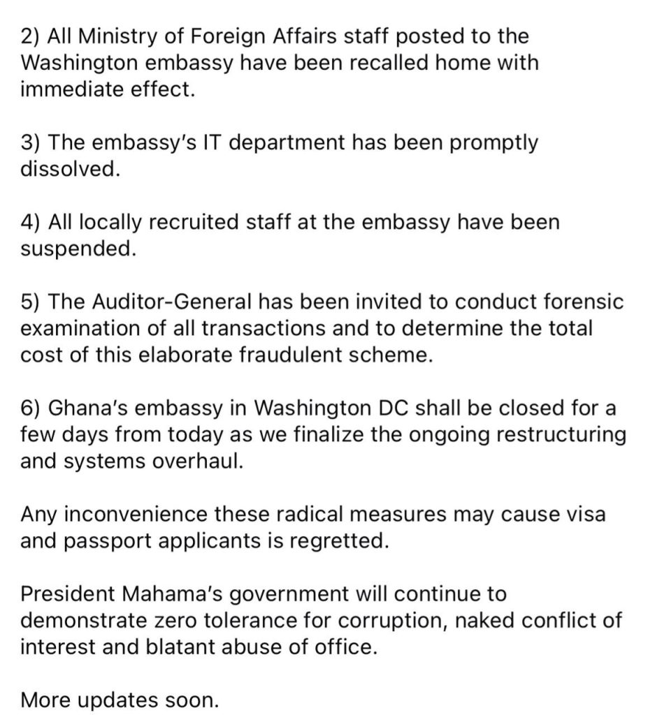 All Ministry of Foreign Affairs staff posted to the Washington mission have been recalled. The entire IT department has been dissolved, and all locally recruited staff have been suspended to facilitate ongoing investigations.