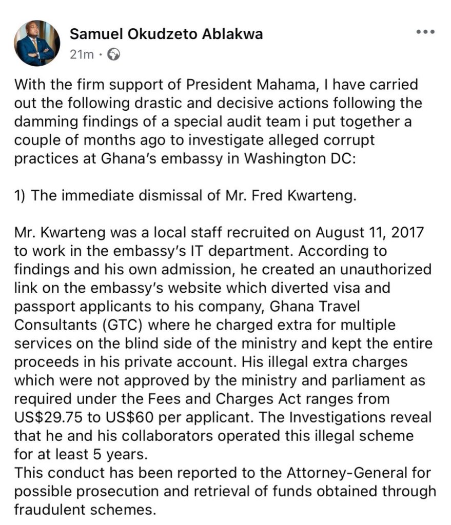 At the center of the scandal is Mr. Fred Kwarteng, a locally recruited IT officer at the embassy, who has been dismissed with immediate effect.