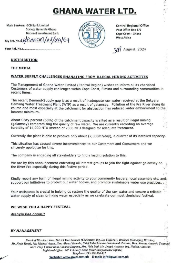 In a press statement signed by management on August 30, 2024, the company explained that the supply gap is due to inadequate raw water received at the Sekyere Hemang Water Treatment Plant, resulting from galamsey activities.