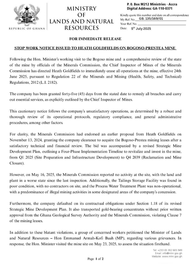 The Ministry of Lands and Natural Resources has issued a “Stop Work Notice” to Heath Goldfields, operators of the Bogoso-Prestea mine, due to poor operations and regulatory breaches.