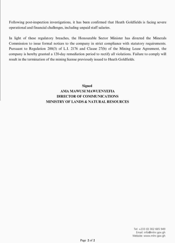 According to the Ministry, the decision was based on the company’s poor compliance with operational protocols, safety rules, and administrative procedures. Though Heath Goldfields was approved in November 2024 to take over the mine after a successful technical and financial review, recent inspections revealed alarming deterioration.