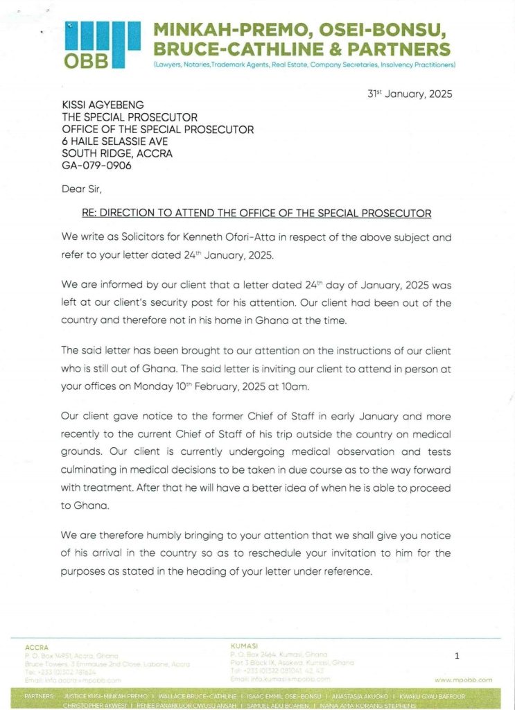 The OSP issued a directive for Mr. Ofori-Atta to appear in person for questioning on January 24, 2025. However, his legal team responded on January 31 that he was already out of the country undergoing medical tests.
