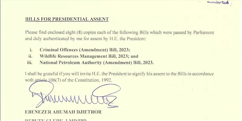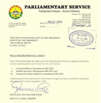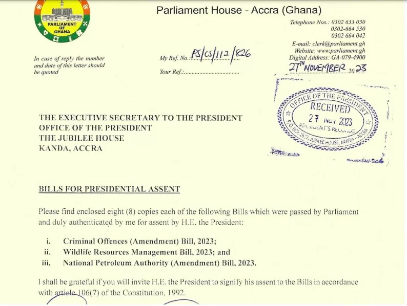 It noted the Bill was officially presented to the President for his assent together with the Wildlife Resources Management Bill, 2023 and National Petroleum Authority Amendment Bill on the same day the Speaker made the accusation.